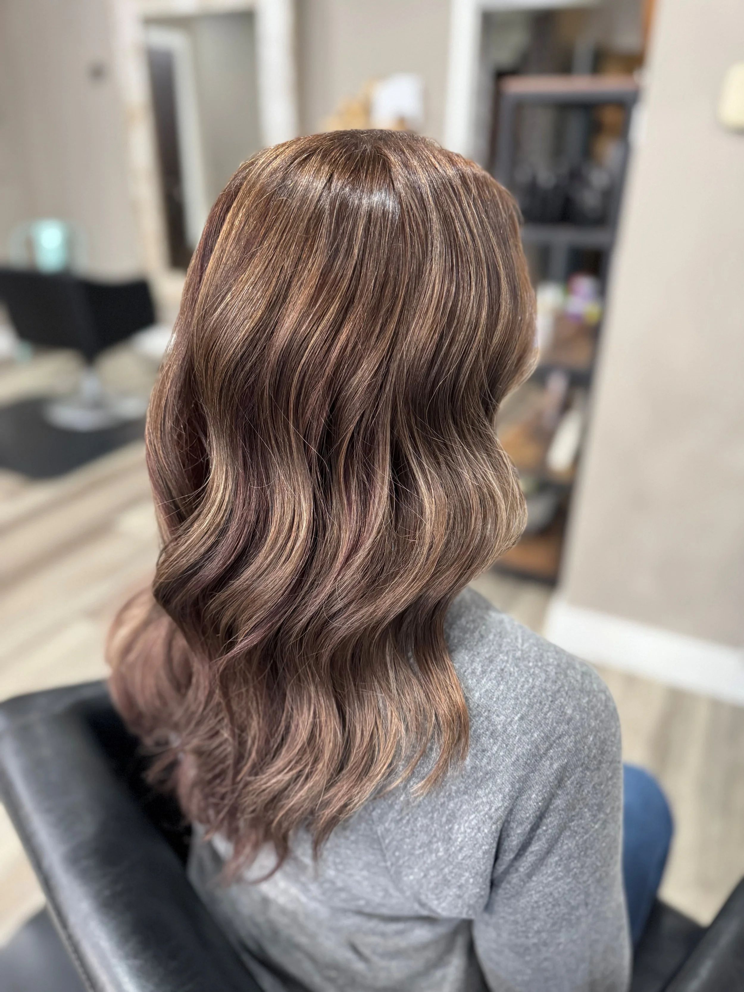 If you are looking for 100% gray coverage and brilliant shine, this is the service for you. Experience a complete hair transformation using one rich color applied globally (all over). This application ensures every strand is coated for a uniform, vibrant look that lasts. The final result is a beautiful, consistent shade with a high-gloss finish that catches the light beautifully!